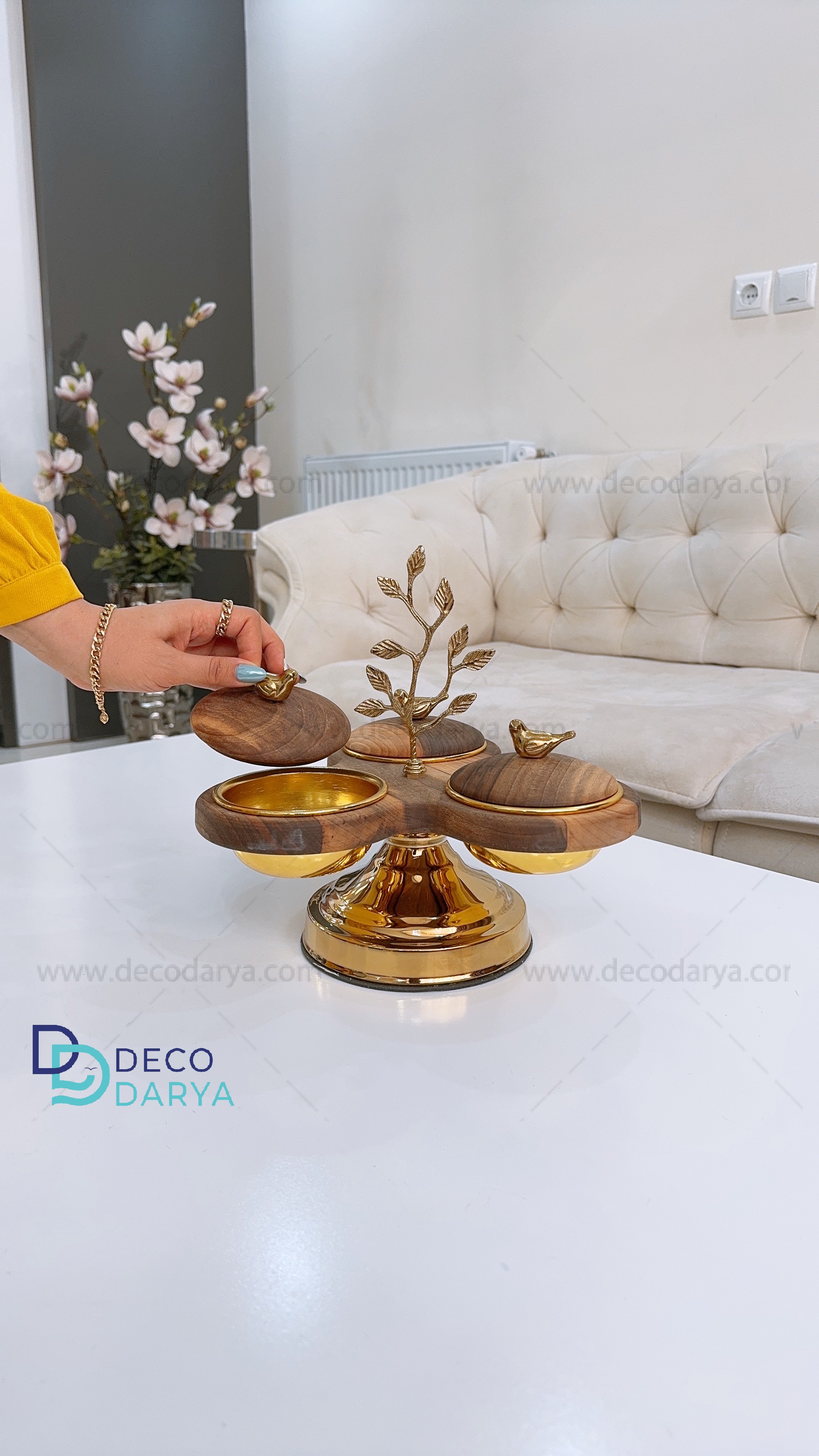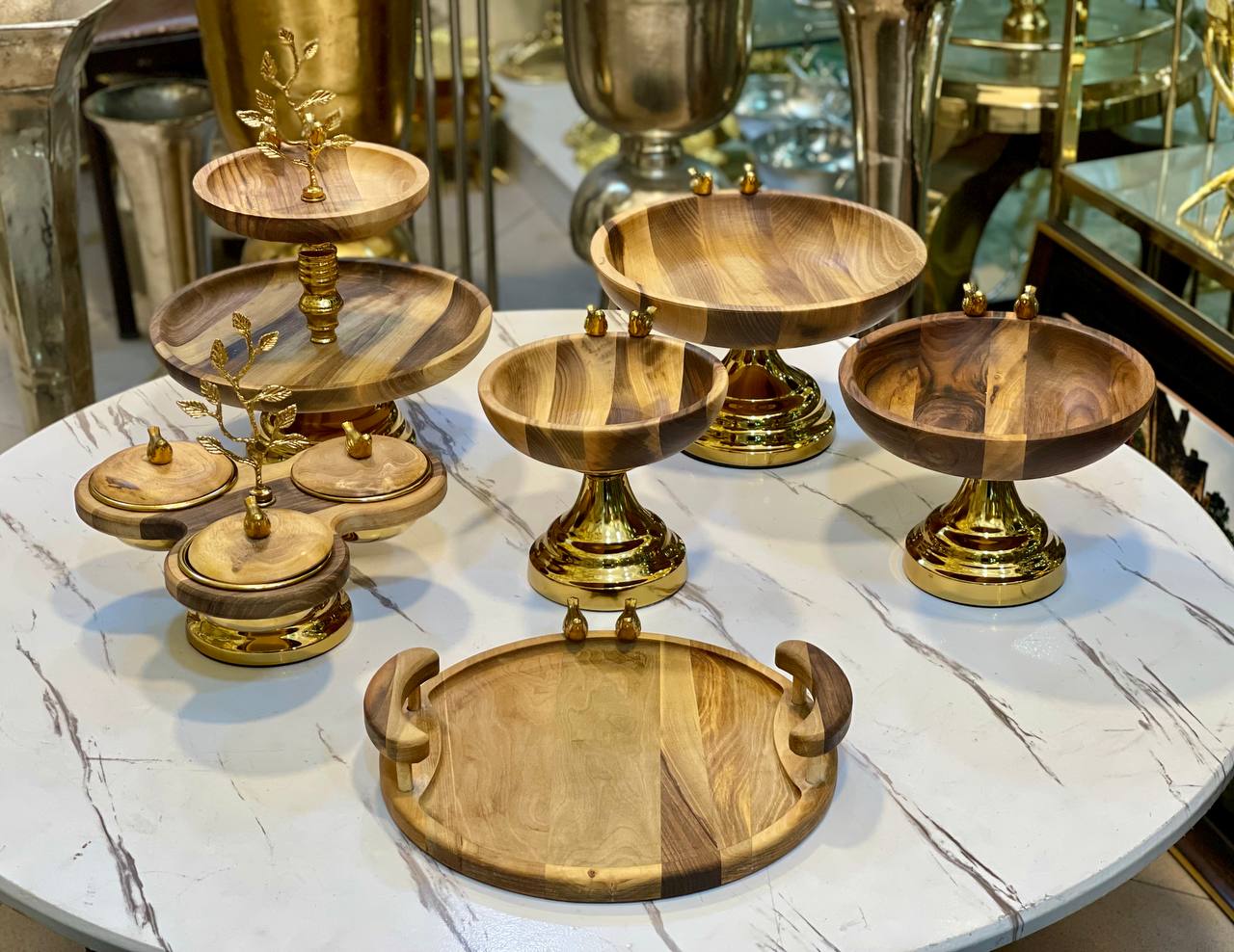 ست شامل پنج تکه میوه خوری،شیرینی خوری، آجیل خوری و شکلات خوری و اردو خوری سه خانه