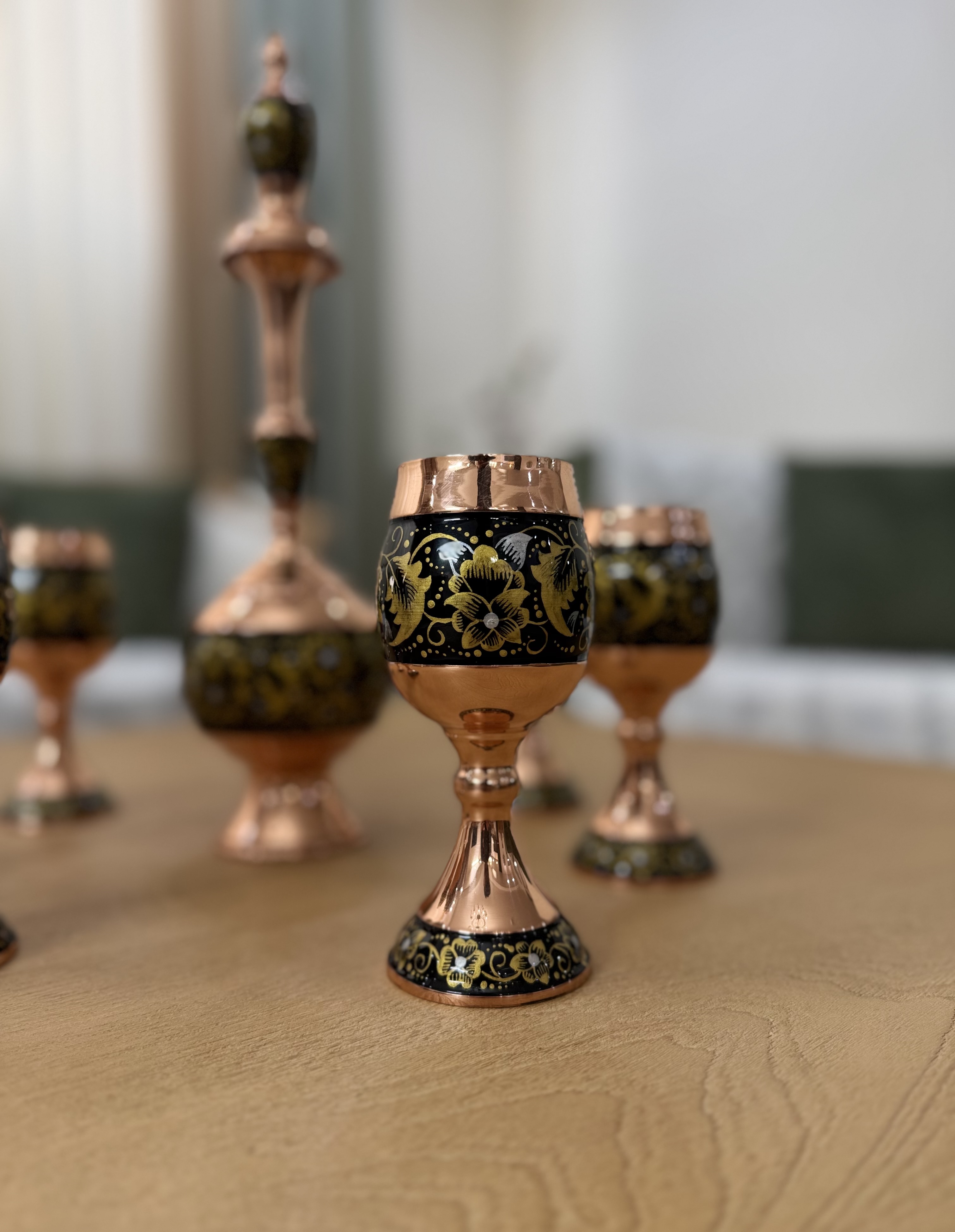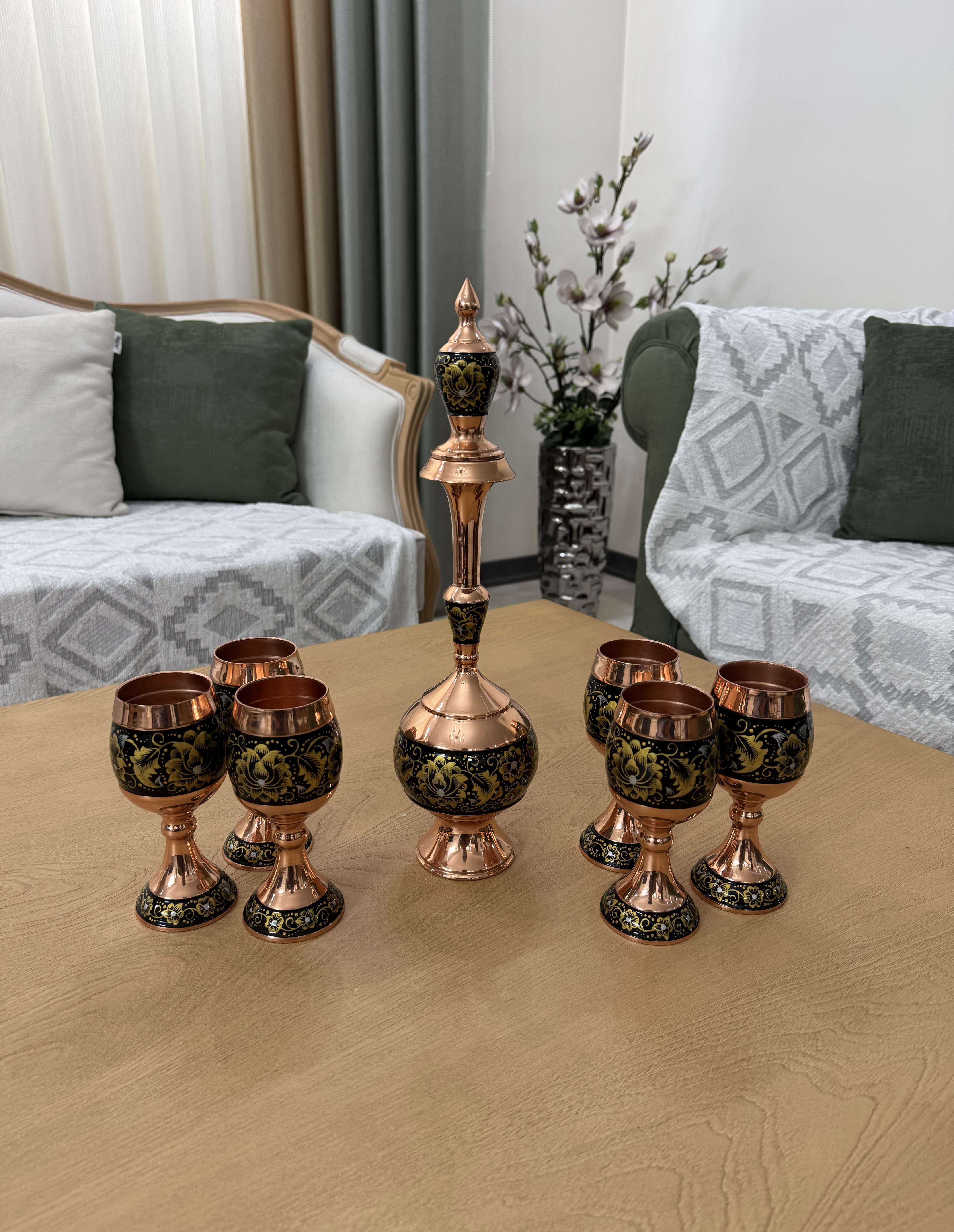 شامل شش عدد جام و یک تنگ /جنس بدنه از مس است که پس از خم کاری و نقاشی با لایه محافظ پلی استر پوشانده شده است./با ضمانت معتبر ثبات رنگ/کیفیت ساخت عالی/مناسبترین قیمت بازار